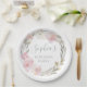 Pretty pink watercolor floral mother's blessing party plates feature the name of the mother-to-be in elegant silver grey calligraphy script, and includes a beautiful pastel floral and greenery wreath border. This lovely paper plate is part of the Christian mother and baby blessing party collection, and is also editable for a variety of occasions and celebrations.