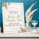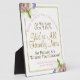 This self standing sign or plaque is perfect for letting your wedding guests know that they can sit where they like at your reception. It features a cute poem that reads: We're so glad you could come, as we said our "I Do"s, we're all family now, so please sit where you choose! The design is classic and elegant with a delicate gold border and clusters of pastel spring flowers at the corners.