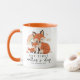 This mug features a soft pastel illustration of a fox mother and her baby placed under a muted rainbow. The simple composition highlights their connection through a calm and loving pose. The design includes names and a year, making it suitable for marking a first Mother’s Day. The soft tones and balanced layout create a cozy and gentle look.