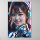 A young woman with a bright smile is dressed in futuristic attire, featuring neon-lit headphones and a high-tech suit. She appears to be in a sci-fi setting with glowing lights that enhance the vibrant atmosphere.