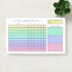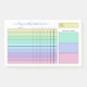 Weekly habit tracker post-its with charts filled in with pastel colours ranging from yellow to green to purple to pink. Add your name in a blue script. The habit tracker notepad features a handy chart where you can check off each day of the week with up to ten habits. Add the time period by hand. And jot down three weekly goals too! All categories are customizable in case you want to change the wording or even the purpose of the planner.