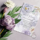 Wedding Invitation | Faint watercolor splash brush strokes are used in this rustic BOHO floral design, which includes pale pastel lilac violet peony blossoms and white anthurium with pale sage green foliage.