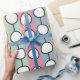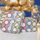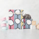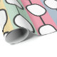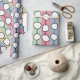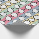 This wrapping paper has a mid-century modern design of white “deformed” circles connected with black lines on a field of pale green, pale pink, pale blue, and pale yellow strips. If you like the design but prefer different colours, message me.