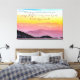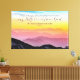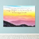 Beautiful pastel pink, purple, and yellow sunrise over mountains stretched canvas print featuring the quote "My help comes from God" Psalm 121 (paraphrased) in elegant deep purple script font.