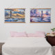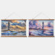 This coastal-themed design set showcases two distinct lighthouse scenes, capturing the ever-changing beauty of the Atlantic shoreline. One piece features a dreamy sunset behind the iconic Cape Hatteras lighthouse, painted in soft watercolor tones of lavender, blush, and cerulean, with gently rolling waves reflecting the warm glow of dusk. The second contrasts it with an intense seascape, where dramatic clouds churn over crashing waves and golden light filters through the storm. Together, these two visuals offer a stunning juxtaposition—tranquillity versus tempest—making them perfect for displaying side by side. Ideal for anyone drawn to maritime landscapes, romantic skies, or nautical nostalgia, this set evokes the passage of time and the enduring strength of coastal sentinels. Whether styled in a beach-themed space or used as a focal point in a moody interior, these pieces convey both emotion and movement. AI generated artwork.