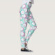 These leggings have a pattern of scattered ovals in turquoise and purple with white ovals and circles with lines inside.
