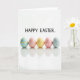 Designed with a calm spring look, the scene places five decorated egg-shaped objects in a neat row along the lower third of a bright white background. Each one carries a soft pastel shade—light blue, gentle pink, warm yellow, another blush pink, and a speckled blue—arranged like friends standing close together 🐰. They sit on a glossy surface that shows a faint reflection, like a quiet nod between companions. Above them, the words “HAPPY EASTER.” appear centered and slightly higher on the page in a friendly, flowing style, colored in a medium gray. The decorations mix tiny dots, slim stripes, and zigzag lines, giving each egg its own personality while still feeling connected 🌷. The wide open white space around everything keeps the focus on the group, like a simple stage for a soft, affectionate moment. Along the bottom, the row of pastel eggs stretches evenly from left to right with their subtle reflections shimmering underneath.