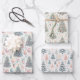 Cute wrapping paper in three different patterns of pink, white and blue Christmas trees with presents and decorations