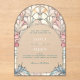 This invitation was born from the timeless romance and ethereal glow found in the great cathedrals of the world. It is inspired by the intricate beauty of Art Nouveau stained glass, where sunlight transforms simple colors into a dazzling, spiritual experience. We wanted to capture that feeling—that sense of breathtaking light and enduring artistry—and translate it into the first glimpse of your wedding day. The soft pastel florals and elegant arched frame are designed to invoke a romantic secret garden, bathed in the soft glow of dawn, setting the perfect, enchanting tone for your celebration.