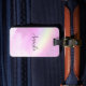 A luggage tag with a beautiful background. A pink pastel sky with fluffy clouds and a lemon coloured rainbow. Magical and whimsical design.