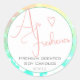 Make a lasting impression with this elegant product label design featuring a light teal and pink border frame on white with a small heart symbol on it.