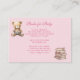 This adorable baby shower enclosure card has a sweet poem asking your guests to bring a Book for Baby as a special gift. The design features a whimsical teddy bear reading a book and a stack of childrens books next to her. The background has a pink with white polka dots pattern. The reverse side has the same pattern and a teddy bear sitting reading a book.