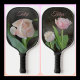 This single fancy pastel pink tulip framed and wrapped in green leaves against is a dramatic floral Pickleball paddle. A pale pink bud and flower adorn the second side. Set against a dark black background, her name can be persona6 for a truly beautiful and elegant gift to by treasured.