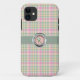 Pretty iPhone 5 Case-Mate Case done in a pastel pink, mint green, and yellow plaid pattern. Graphics of a green band, across the middle, is decorated with a pink and silver tone button, with a one letter green monogram. Personalize the letter for yourself or as a great gift idea. Stylish way to protect your electronic device.