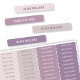 Personalized kid's waterproof name labels with a pastel purple colour-coded design in neutral tones for girls. These colourful rectangle labels are great for your son or daughter's school supplies, lunch box or container, notebooks, books, etc.