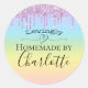 This custom sticker label features a whimsical and enchanting rainbow theme. A pastel colour rainbow gradient runs horizontally across the background. The colours follow the pattern of the typical rainbow with pink, orange, yellow, green, blue and purple. pink glitter style drips are featured dripping across the top. The phrase "Lovingly Homemade by" is printed at the top with a swirly heart illustration placed in between the text. You can personalize the sticker to include your own name and custom text. It's perfect for labelling your home made or handmade treats, beauty products, candles, or other hand made items.