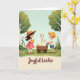 Designed with a springtime scene, two young children walk together across rolling green grass, their gentle smiles and close spacing suggesting an easy friendship. A fair-haired boy pushes a rustic wooden wagon while glancing toward a white rabbit 🐰 sitting inside, its pink-lined ears standing tall and a faint rosy tint on its cheeks. Beside him, a dark-haired girl in a coral-pink dress and wide-brimmed straw hat with a matching ribbon cradles a fluffy yellow duckling, holding it near her chest as if sharing a quiet moment. A second small duckling peeks out from the wagon, adding a sweet bit of motion to the little parade. Around them, scattered pink and orange wildflowers dot the grass, and pale tree trunks rise into rounded green canopies under a pale blue sky. The words “Joyful Easter” sit along the bottom in a flowing, dark-toned lettering style that stands out against the lighter ground, with a small 🌷 accent nearby. The wagon’s wooden slats and wheels are lightly shaded, and the rabbit’s ears show soft pink detail inside.
