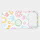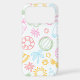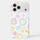 A pastel summer doodle phone case featuring cute beach icons like palm trees, sunglasses, watermelon slices, coconuts, sun shapes, tropical drinks, and summer accessories in a soft outline style.