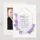 Watercolor violet - lilac floral wedding invitation with a gold herbarium geometric frame customizable to your event specifics. Ideal for any given theme or garden wedding. The photo on the reverse is optional. If you would rather remove it, scroll down to the bottom of "Personalize this template" and click on "Edit Using Design Tool". In the Design Tool you can edit, scale, delete or move any text or design elements you wish.