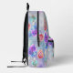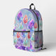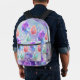 This customizable backpack is a piece of art that captures the essence of a serene and magical garden. The backdrop, painted in soft hues of lavender and sky blue, is speckled with delicate white/orange splatters, reminiscent of a starlit sky or the first snowfall. Scattered leaves, each intricately detailed with fine lines depicting the veins, float gracefully on this enchanting canvas. These leaves, painted in harmonious pastel shades of purple, pink, blue, orange and teal, are bordered by an ethereal glow of purple, blue and pink watercolors. The colours bleed softly into the background, creating a dreamy and captivating effect. The text is fully customizable.