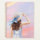 This digital artwork captures a serene moment with a woman facing away, gazing at a pastel sunset. Her flowy dress and wide-brimmed hat, accented with a blue ribbon, evoke a sense of carefree summer days. The soft, blended colours and whimsical style create a dreamy atmosphere, perfect for evoking feelings of peace and nostalgia.