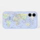 This pastel-colored world map phone case features continents, countries, and islands, surrounded by a soft light-blue ocean. The design is based on a public domain world map and uses gentle pastel tones, with light blue as the main color.