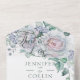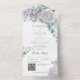 AVAILABLE WTH OR WITHOUT A QR CODE T SCAN IN THE RSVP AREA. This design has beautiful white floral blooms with periwinkle buds, surrounded by soft greenery. The floral design is placed on a white background. Add a QR code to your invitation so that gusts can quickly access your wedding Website for details, directions, menu options, and more, or add your gift registry Web URL. Personalized All-In-One invitations are a unique combination of both a beautifully printed custom invitation with an easy to tear off perforated RSVP postcard. And they are so easy to use! You simply fold, then seal the back flap with the three included clear stickers, and mail. And when your guests receive your custom invite, they just tear the perforated RSVP Card off and drop it back in the mail to you!