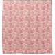 A red toile de jouy pattern of a little village, with trees, houses, churches, and people, creates a beautiful and traditional design on this shower curtain.
