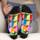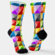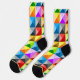 Many triangles in yellow, orange, red, pink, blue, green colours creating fun modern geometric patterned pillow.