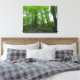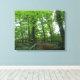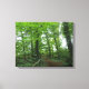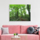 This awesome canvas print features a photograph taken in a forest in England. The beautiful trees glow with an intense green as they reach up towards the sky. A small path winds its way deep into the woods surrounded by tall trees.