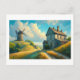 A quaint countryside scene features a rustic house in the foreground, while a windmill stands atop a grassy hillside under a bright, cloudy sky. The landscape is lush with green and yellow hues, creating a serene and idyllic atmosphere.