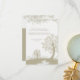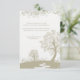 A muted scene featuring a garden with trees and a winding path to the distance. The top is bordered with a coordinating abstract trim. The background has fine horizontal pin-stripes in light grey. The card is easy to customize with your wording, font, font colour and choice of six paper types.