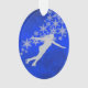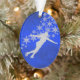 Cet ornement de Noël présente une patinoire féminine silhouette argentée devant un jet de flocons d'argent. L'image est placée sur un arrière - plan abstrait bleu vif. L'arrière de l'ornement a le même arrière - plan bleu avec des champs de texte pour vous de customiser. Parfait pour le patin à glace ou le patineur sur glace, et fait aussi un grand gardien pour un enfant de parents ou grands-parents.
