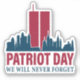 This sticker features the World Trade Centre and Twin Towers with the texts "We Will Never Forget", and "Patriot Day". It is to commemorate the September 11 terrorist attack of the World Trade Centre. It is perfect for the survivors, family members, friends, and first responders during the attack on its 20th anniversary.