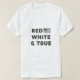 This T-shirt features a bold and patriotic design with the phrase “RED WHITE & TRUE” in capitalized letters. Above the text, there is an image of the United States flag in grayscale. The design evokes a sense of national pride and is perfect for those who want to showcase their love for the USA. Made from high-quality, comfortable fabric, this T-shirt is ideal for casual wear and makes a strong statement.