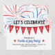 Let's Celebrate America large and at the top. America is in white letters in red bunting flag. Fireworks in the background, with party details at the bottom. Fourth of July Party is in blue, with a red star on both sides.