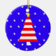 This Patriotic American Christmas ornament features a blue background with white stars and a red and white stripe Christmas tree. A great way to show your Patriotic American spirit on the Christmas tree! Copyright Ornaments by Henis