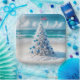 A white Christmas tree adorned with blue and silver ornaments stands on a sandy beach topped with an American flag