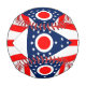 Crafted with precision and attention to detail, this baseball ball showcases the vibrant colours and symbolism of the Ohio state flag. The design prominently displays a swallowtail-shaped burgee with three alternating red and white horizontal stripes. In the blue triangle on the left side, there are 17 white stars surrounding a red circle with a white O.