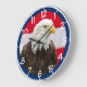 A wonderful image of a bald eagle posing in front of an American Flag.