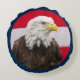 A wonderful image of a bald eagle posing in front of an American Flag.