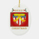 A beautiful double sided, U.S. patriotic heart, with yellow ribbon oval ceramic ornament. This ornament features a patriotic heart, it's coloured in red white and blue, and has a stars and stripes design to reference the American Flag. The heart also has a golden trim, and a big yellow support the troops ribbon on top. The heart is on a glowing look red background. The ornament reads Merry Christmas in a beautiful golden lettering with holly and berries on top! This unique digital artwork is displayed on both the front and back of the ornament. A beautiful ornament to support the troops, for friends and family, a great addition to any ornament collection, a great gift for a veteran or someone currently serving in the U.S. military, or a patriotic collector. This design is available on different shapes and styles of ornaments and other wonderful gift items too. For more military Christmas holiday themed styles of ornaments, gifts, stickers, tags, cards, stamps and much more please visit our store!