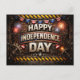 Celebrate Independence Day with rugged industrial style in this bold patriotic design. Weathered metal textures, riveted steel panels, and mechanical gear accents frame strong block lettering set against explosive fireworks. Striped caution borders and classic red, white, and blue bunting add a striking contrast to the dark, distressed background, creating a powerful, modern take on Fourth of July celebration.