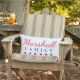 Home accent lumbar pillow features a custom family last name / surname monogram in patriotic red, white, and navy blue colours.