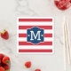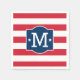 Patriotic paper napkins feature a decorative frame with custom monogram initial, star accents, and horizontal stripes. Navy blue, red, and white colours.