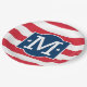 Patriotic paper plate design features a decorative frame with custom monogram initial, star accents, and horizontal stripes. Navy blue, red, and white colours.