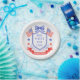 This patriotic bridal shower paper plate design features a watercolor crest with a light red white and blue patriotic crest with American flags and a blue bow. Text in the center of the crest says "Red, white and I do."