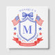 This patriotic bridal shower guest book design features a watercolor crest with a light red white and blue patriotic crest with American flags and a blue bow. You can personalize with your monogram and name.