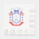 This patriotic wedding napkin design features a watercolor crest with a light red white and blue patriotic crest with American flags and a blue bow. You can personalize with your monogram, wedding date and names.