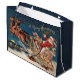 Give your holiday gifts in this beautiful, blue Christmas gift bag. Featuring an old fashioned image of Santa Claus flying his sleigh with reindeer on Christmas Eve. Santa has patriotic, American flags in his sleigh. "Merry Christmas."